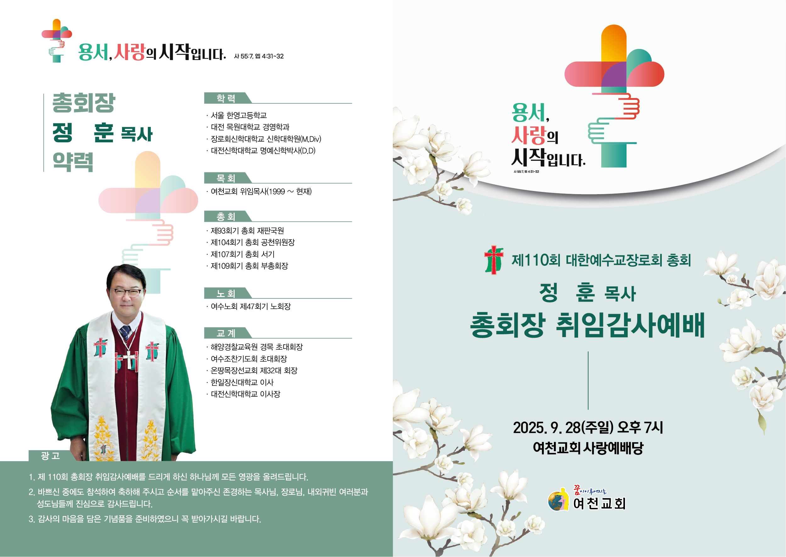 110ȸ Á¤ÈÆ ÃÑȸÀåÈ£ Ãâ¹ü ¿¹¹è ¿©Ãµ±³È¸¼Áö³ 9¿ù 28ÀÏ(ÁÖ) ¿ÀÈÄ 4½Ã ¿©Ãµ±³È¸ º»´ç¿¡¼´Â À̹ø ÃÑȸ¼ ÃÑȸÀåÀ» ½Â°èÇÑ Á¤ÈƸñ»çÀÇ ÃëÀÓ¿¹¹è°¡ ÀÖ¾ú´Ù. ¿¹¹è¿¡´Â 110ȸ ÀÓ¿øµé°ú Á÷Àü ÃÑȸÀå ±è¿µ°É¸ñ»ç Á¤ÈƸñ»ç°¡ ¼±â·Î ¸ð¼Ì´ø À̼øÃ¢ Àü ÃÑȸÀå°ú ¿ì¸®±³´Ü ¿©¼º Àå·Î·Î ÃÖÃÊÀÇ ÃÑȸ ºÎÃÑȸÀåÀ» ¿ªÀÓÇÑ ±è¼ø¹ÌÀå·Î¿Í Áö¿ª³ëȸ¿Í µ¿¿ªÀÚµéÀÌ Âü¿©Çß´Ù. À̹ø ÃÑȸ