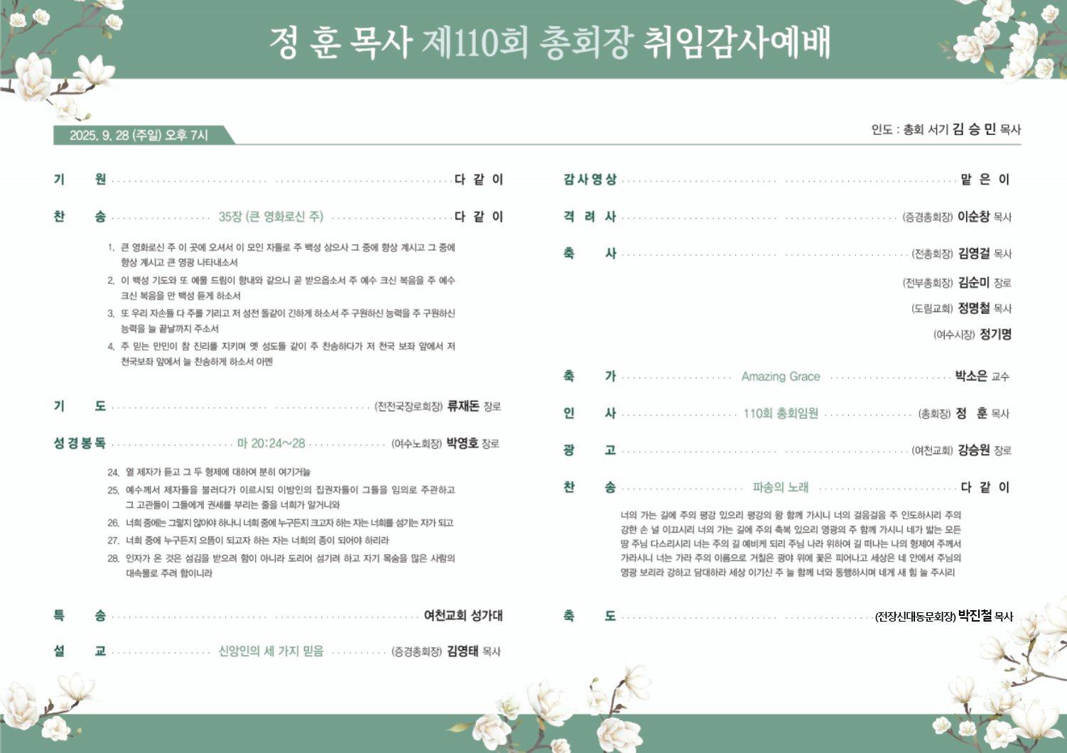 °Ý·Á¿Í ÃàÇÏÀÇ ¸Þ½ÃÁö´Â Àü ÃÑȸÀå À̼øÃ¢ ¸ñ»ç¿Í Á÷Àü ÃÑȸÀå ±è¿µ°É¸ñ»ç¿Í µµ¸²±³È¸ Á¤¸íö¸ñ»ç°¡ Çß´Ù. ¶Ç Á¤±â¸í ¿©¼ö½ÃÀåÀº "113³â Áö¿ª ±³È¸»ç¿¡¼ ù ÃÑȸÀåÀÌ ¹èÃâµÈ °ÍÀº ¿©¼öÀÇ Å« ÀںνÉ" À̶ó¸ç Áö¿ª »çȸ¿Í ±³´ÜÀÇ »ó»ýÀ» ±â´ëÇß´Ù. ¿¹¹è¿¡ ¿©Ãµ±³È¸ ¼º°¡´ë Ư¼Û°ú ¹Ú¼ÒÀº ±³¼ö(Àå½Å´ë)ÀÇ Ãà°¡, Àü Àå½Å´ëµ¿¹®È¸Àå ¹ÚÁøÃ¶ ¸ñ»çÀÇ Ã൵·Î ¿¹¹è¸¦ ¸¶ÃÆ´Ù. Á¤ÈÆ ÃÑȸÀåÀº °¨»ç Àλ翡¼ "±³´ÜÀ» ¼¶±â´Â ±æ¿¡ ºÎÁ·ÇÔµµ ¸¹°ÚÁö¸¸, ¼ºµµµéÀÇ ±âµµ¿Í °Ý·Á°¡ ÀÖ´Ù¸é ¸Ã°ÜÁø Á÷¹«¸¦ Àß ¸¶Ä¥ ¼ö ÀÖÀ» °Í" À̶ó¸ç "»ç¶û°ú ±âµµÀÇ ¿¬ÇÕÀ¸·Î Çϳª´Ô ³ª¶ó¸¦ ¼¼¿ö°¡ÀÚ"°í °Á¶Çß´Ù.