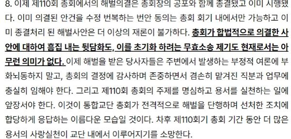 µû¶ó¼ ÀÌ·± °áÀǸ¦ ÁÖµµÇÑ ÃÑȸÀåÀ» ¾Ð¹ÚÇÏ¿© ¹«È¿ÈÇÏ·Á´Â ½Ãµµ´Â ±Ý¹°ÀÌ´Ù. ¶Ç À̰ÍÀ» Á¦±âÇÏ·Á¸é Á¤½ÄÀýÂ÷µµ ¾Æ´Ï±â¿¡ ¹øº¹À» ÇÏ´õ¶óµµ ÀýÂ÷¸¦ °ÅÃļ ÇØ¾ßÁö ¹Ð¸®¸é ¾ÈµÈ´Ù. µû¶ó¼ ȸ·ÏäÅà ÀÓ¿øÈ¸¼ ´Ù¸¥ °ÍÀº ¹Þ°í ÀÌ Á¶Ç׸¸ ±ÔÄ¢ºÎ¿¡ ÁúÀÇÇÏ´Â °ÍÀÌ´Ù. ±×·¡¼ ¾ÕÀ¸·Î À߸øµÈ °áÀÇ¿¡ ´ëÇØ¼´Â ÃÑȸ¹ý°ú Á¤¼ ¿ª»ç¼º Çö½Ç¼ºÀ» °í·ÁÇÏ°í ±× ÆÇ´ÜÀ» ½ÇÇàÀ§¿Í °°Àº Á¶Á÷À» ÅëÇÏ¿© °Å¸£´Â °ÍÀ» ¾ÕÀ¸·Î ¿¬±¸ÇØ Áֱ⠹ٶõ´Ù.