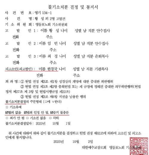 10¿ù 1ÀÏ, ¿µµîÆ÷³ëȸ ±â¼ÒÀ§¿øÈ¸(ÀÌÇÏ ±â¼ÒÀ§)´Â Ȱ±³È¸ ÇѰ汹 ¸ñ»ç¿¡ ´ëÇÑ °í¹ß °ÇÀ» ½É¸®ÇÑ °á°ú ºÒ±â¼Ò óºÐÀ» ³»¸®°í 2ÀÏ ¾çÃø¿¡ À̸¦ Å뺸Çß´Ù. ÇØ´ç °í¹ßÀº 2ÀÎÀÇ ¾È¼öÁý»ç¿Í 1ÀÎÀÇ ¿ÜºÎ ¾ð·ÐÀ» ÇÏ´Â ÀºÅð¸ñ»ç°¡ Á¦±âÇÑ °ÍÀ¸·Î, ±â¼ÒÀ§´Â ¾çÃøÀÇ ÀǰßÀ» ÃæºÐÈ÷ ûÃëÇÏ°í ½ÅÁßÇÑ °ËÅ並 °ÅÃÄ ÀÌ·¯ÇÑ °á·Ð¿¡ µµ´ÞÇÏ¿´´Ù.