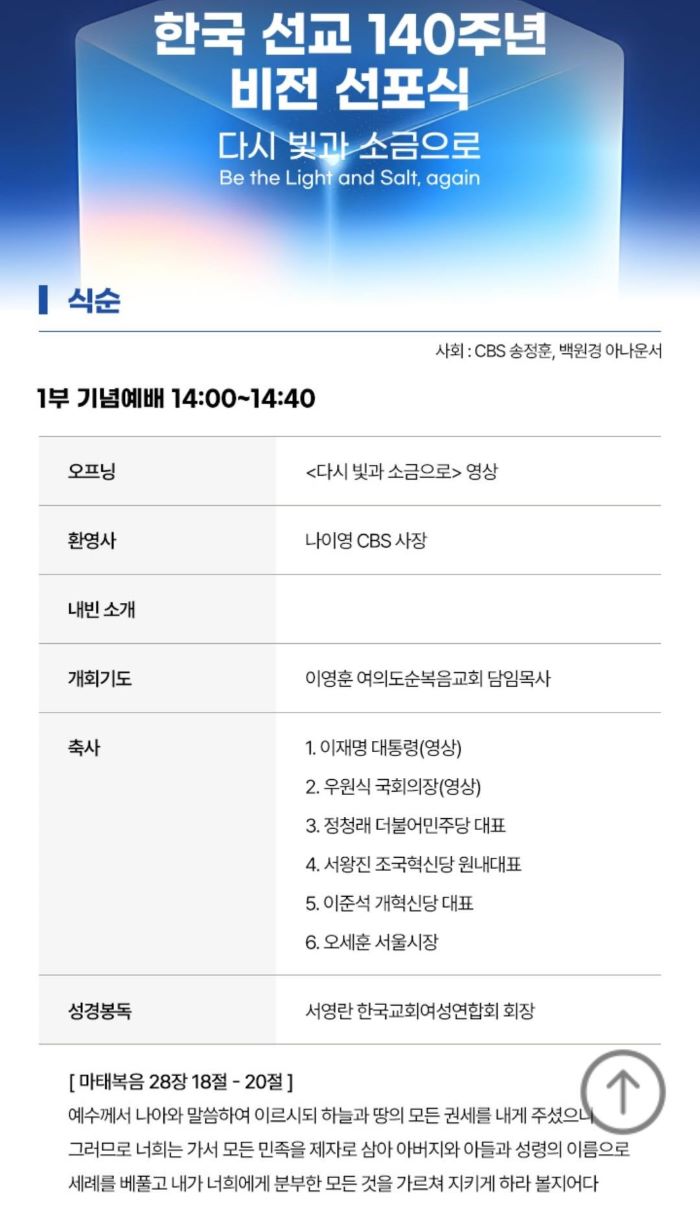 Çѱ¹±³È¸¸¦ ´ëÇ¥ÇÏ´Â ¹æ¼Û¼±±³ÀÇ »êÁõÀÎ CBS(ÀÌ»çÀå: ¼Ò°¼®¸ñ»ç, »çÀå: ³ªÀÌ¿µ¸ñ»ç)°¡ ÁÖÃÖÇÏ´Â ‘Çѱ¹ ¼±±³ 140Áֳ⠺ñÀü ¼±Æ÷½Ä: ´Ù½Ã ºû°ú ¼Ò±ÝÀ¸·Î’ °¡ ¿À´Â 15ÀÏ ¼¿ï ¿©Àǵµ Æä¾î¸óÆ® ¾Ú¹è¼´õ ¼¿ï ±×·£µåº¼·ë¿¡¼ ¿·È´Ù. CBS¿Í NCCK, Çѱ³ÃÑÀÌ °øµ¿À¸·Î °³ÃÖÇÑ À̳¯ Çà»ç¿¡´Â ¾ð´õ¿ìµå, ¾ÆÆæÁ©·¯ ¼±±³»ç°¡ Á¶¼±¿¡ º¹À½ÀÇ ¾¾¾ÑÀ» »Ñ¸° Áö 140ÁÖ³âÀÌ µÇ´Â ¶æ±íÀº ÇØ·Î ¼±±³»çµéÀÇ Á¤½ÅÀ» ±â¸®°í, Çѱ¹±³È¸°¡ ½Ã´ëÀû °¥µîÀ» ³Ñ¾î ¿¬ÇÕ°ú ÈÇÕÀÇ ±æ·Î ³ª¾Æ°¡±â À§ÇÑ »õ·Î¿î ºñÀüÀ» ¼±Æ÷ÇÏ´Â ÀÚ¸®·Î ¸¶·ÃµÆ´Ù.