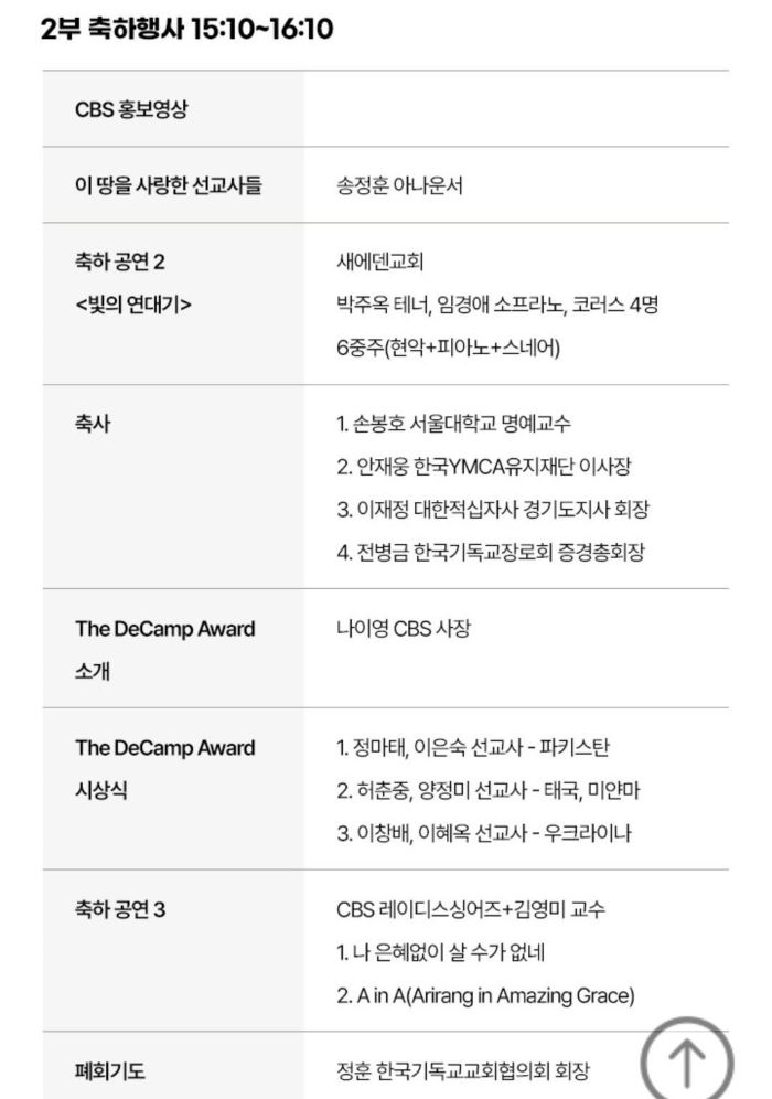 Çà»ç¿¡´Â ÁÖ¿ä ±³´Ü°ú ¿¬ÇÕ±â°ü ´ëÇ¥µéÀÌ Âü¼®ÇØ º¸¼ö¿Í Áøº¸¸¦ ¾Æ¿ì¸£´Â Çѱ¹±³È¸ÀÇ ´ë¿¬ÇÕ ¸Þ½ÃÁö¸¦ ÀüÇÑ´Ù. ¼±Æ÷½Ä¿¡¼´Â ‘Çѱ¹ ¼±±³ ¹Ì·¡ ºñÀü ¼±¾ð’ÀÌ °ø½Ä ¹ßÇ¥µÇ¸ç, ´Ù¾çÇÑ ¼¼´ë°¡ Âü¿©ÇÏ´Â ‘¿ì¸®ÀÇ ´ÙÁü’ ¼ø¼¸¦ ÅëÇØ Çѱ¹±³È¸°¡ ½Ã´ëÀû Ã¥¹«¸¦ ¼öÇàÇϰڴٴ ½Çõ ÀÇÁö¸¦ õ¸íÇß´Ù. ÀÌ¿Í ÇÔ²² ¼±±³»ç·Î Çѱ¹¿¡ ¿Í CBS¹æ¼ÛÀ» ¼³¸³ÇÑ ¿ÀÅä µðÄ·ÇÁ(Otto DeCamp)ÀÇ Á¤½ÅÀ» ±â¸®´Â ‘The DeCamp Award’(µðÄ·ÇÁ»ó) ½Ã»ó½Äµµ ¿·È´Ù.