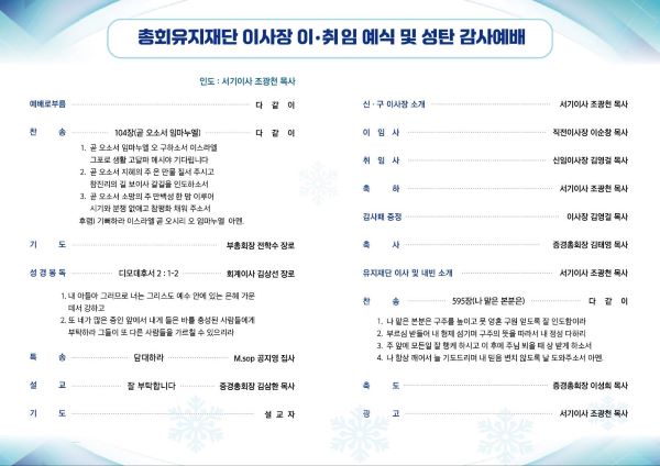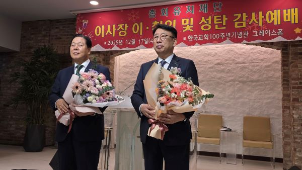 ÃÑȸ Àç»êÀ» °ü¸® °¨µ¶ÇÏ´Â À¯ÁöÀç´Ü ÀÌ»çȸ°¡ ½ÅÀÓ ÀÌ»çÀå°ú ÀüÀÓ ÀÌ»çÀå ÀÌÃëÀÓ½ÄÀ» °®¾Ò´Ù. ÀÌ»çÀåÀº ÀüÀÓ ÃÑȸÀåÀÌ ¿ªÀÓÇϵµ·Ï µÇ¾î ÀÖ´Â ¹Ù Á÷Àü ÃÑȸÀå ±è¿µ°É¸ñ»ç»ç »õ ÀÌ»çÀåÀ¸·Î ÃëÀÓÀ» ÇÑ °ÍÀÌ´Ù. ÀÌÀü ÀÌ»çÀåÀº ¿ø·¡ 108ȸ±â ÃÑȸÀåÀ̾ú´ø ±èÀǽĸñ»ç¿´À¸³ª »çÁ¤»ó ¿ªÀÓÄ¡ ¸øÇÏ°í ±× ÀÌÀü ÃÑȸÀåÀ̾ú´ø 108ȸ ÃÑȸÀå À̼øÃ¢¸ñ»ç°¡ ¿ªÀÓ Çß¾ú´Ù.